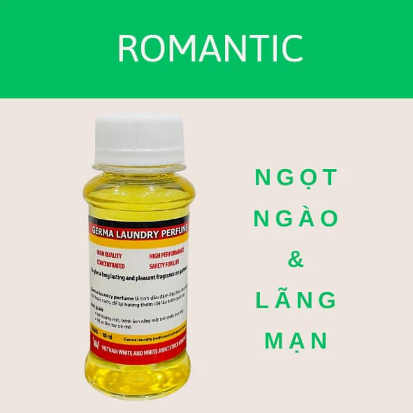 Tinh dầu Germa là thương hiệu tinh dầu thơm cao cấp, chủ yếu được sử dụng trong các tiệm giặt sấy chuyên nghiệp để tạo hương thơm cho quần áo. Sản phẩm này có đặc điểm là tan hoàn toàn trong cồn hoặc nước, giúp hương thơm lan tỏa đều và bền lâu. Tinh dầu Germa có nguồn gốc nhập khẩu từ Châu Âu và được đánh giá là an toàn cho mọi loại vải. Sản phẩm được nhập khẩu và phân phối trực tiếp bởi White & White Việt Nam